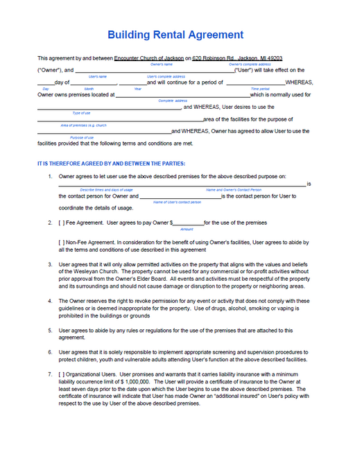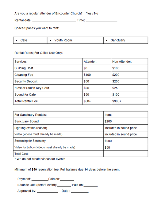 We love to open our church building for special events and gatherings. If you are interested in using the Encounter Church facility please read the Building Rental Agreement in its entirety below.